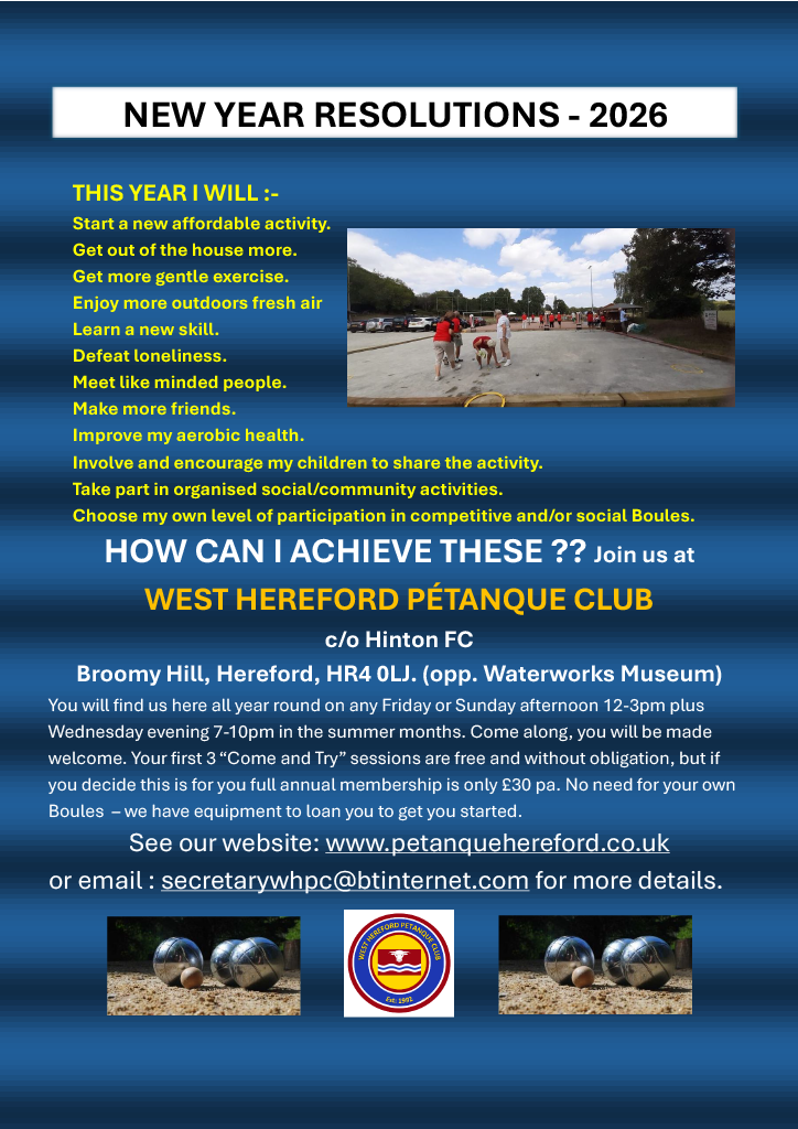 As a group of Hereford Pétanque enthusiasts and with the help and support of our hosts at Hinton FC, we have formed a new Petanque Club with exceptional social and playing facilities within Hereford City boundaries. Currently WHPC has 42 members from 8 - 80 years of age and is run by its members. Each member can decide how often they play and to what level, from social friendly boules with other members or competitive boules in leagues or other club competitions. Or alternatively just relax in good company, drink tea and have a natter.